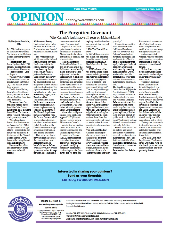 To restore the Haldimand Covenant is not to undo Canada. It is to restore the balance that made Canada possible.
