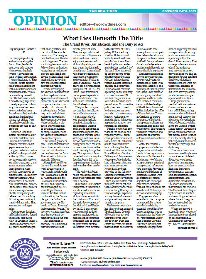 “Bloodline” follows the Haldimand Proclamation from its original promise to the present fight to have it honoured. The track moves through Crown grants, broken commitments, and the legal and political road back to enforcement, asking listeners to hear the Proclamation not as a relic of the past, but as a living obligation that still binds the Crown to the Mohawk Nation of Grand River.